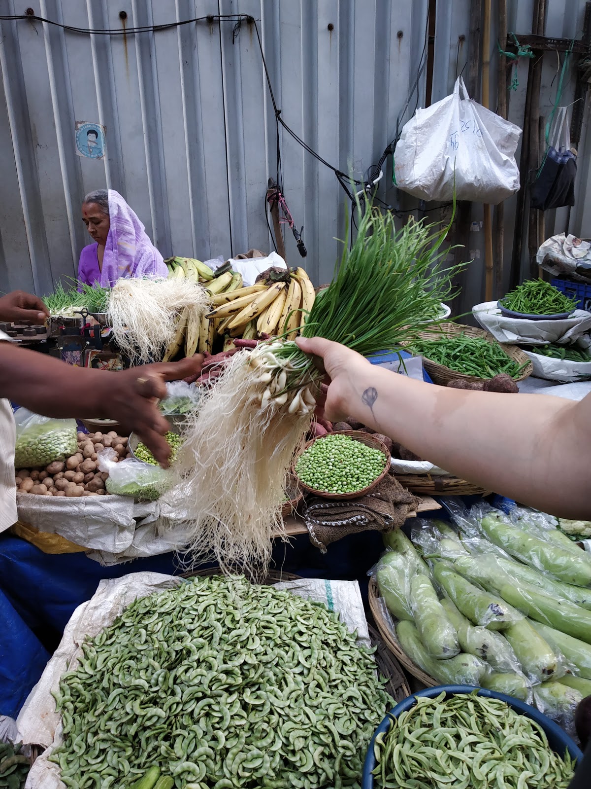 Bright orange fingers turmeric root, and knobbly knuckles of mango ginger wafting their aroma of raw mango, reminiscent of summer. Bunches of green garlic with their wispy white beards. Radishes and carrots - with their big bunches of leaves - swelling with pride as they strive to impress every shopper that passes. And a whole palette of purples: from burgundy amarant leaves or